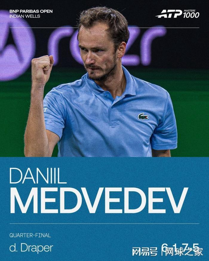 八分之一决赛对阵德约还生龙活虎的德雷珀,迎战梅德韦杰夫状态下滑明显,首盘就被俄罗斯名将按在地上暴揍,迅速以1比6交出了第一盘的胜利。